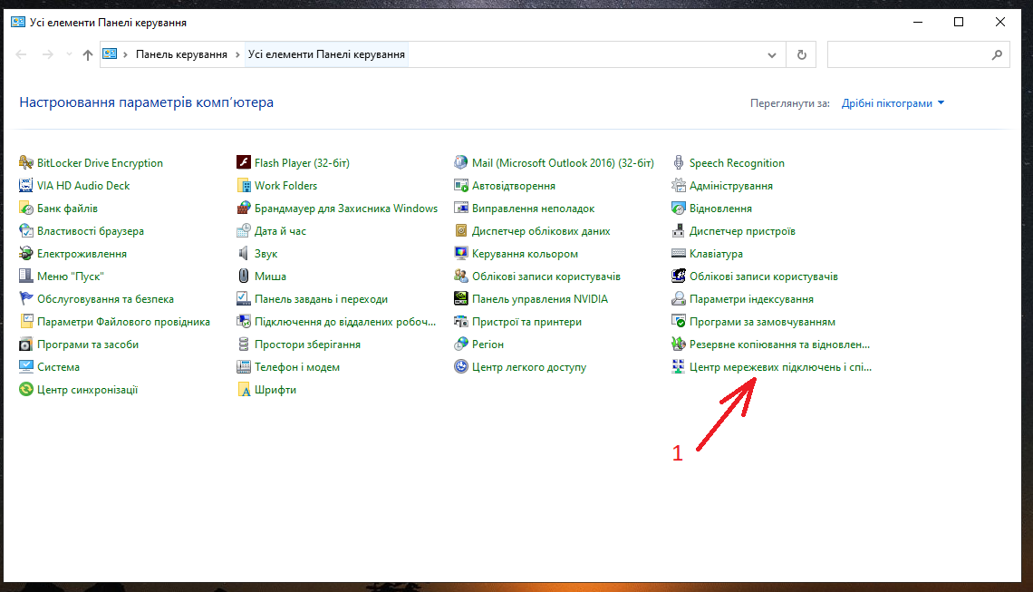 1. Відкриваємо в панелі керування комп’ютера Центр управління мережевих підключень і спільного доступу
