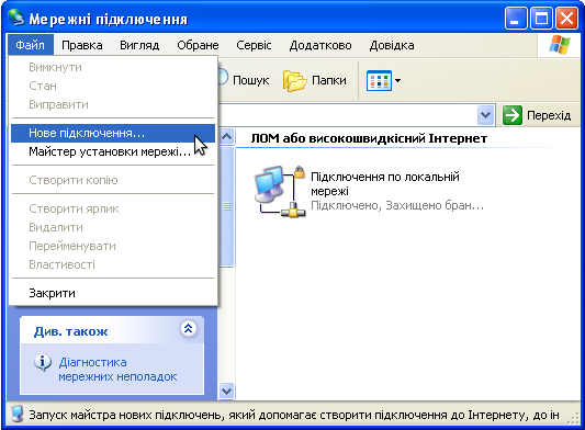 3. В головному меню вікна Мережні підключення відкриваємо Файл, далі  обираємо Нове підключення: