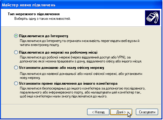 4. У вікні, що відкрилось Майстер нових підключень натискаємо Далі, у діалоговому вікні Тип мережного підключення обираємо пункт Підключитися до Інтернету  натискаємо Далі: