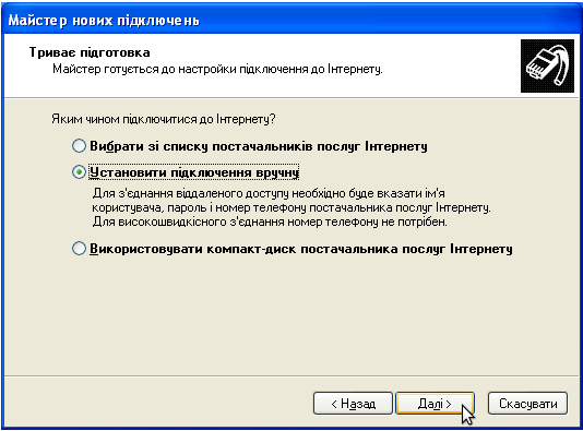5. У діалоговому вікні Триває підготовка обираємо пункт Установити підключення вручну та натискаємо Далі: