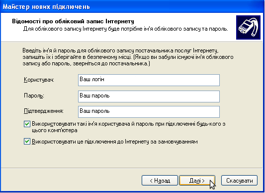 7. У діалоговому вікні Відомості про обліковий запис Інтернету в полях Користувач та Пароль вводимо логін та пароль, що надані Вам при підключенні. В полі повторно введіть свій пароль та натисніть Далі: