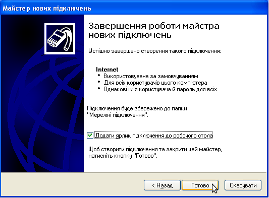 8. У діалоговому вікні Завершення роботи майстра нових підключень, радимо поставити галочку навпроти  Додати ярлик підключення до робочого стола, натискаємо Готово: